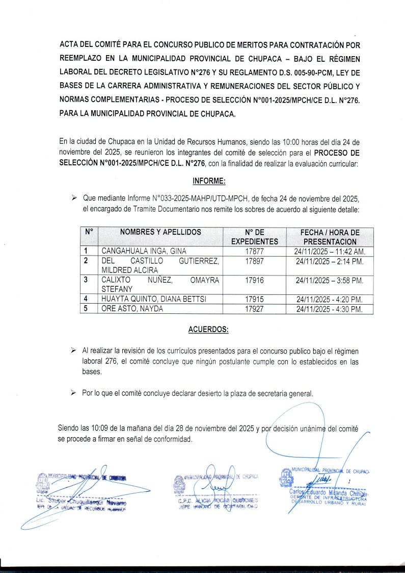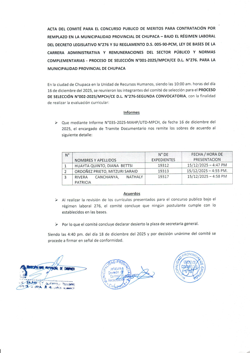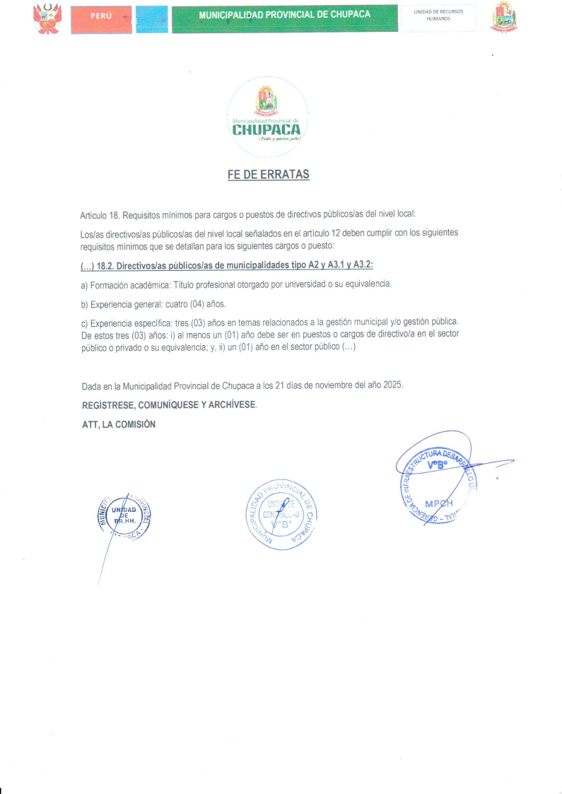 COMUNICADO: los postulantes que tienen la condición de APTO, deberán de presentarse el día miércoles 05 de marzo del 2025, en las instalaciones de la Municipalidad Provincial de Chupaca a partir de las 3:00 pm en el auditorio de la municipalidad (segundo piso).